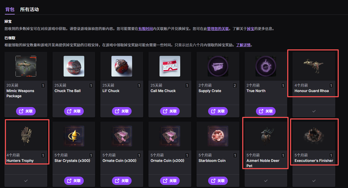 注:关联成功后, 其他奖品隐藏在Twitch背包的内奖品仍然可以正常到账。