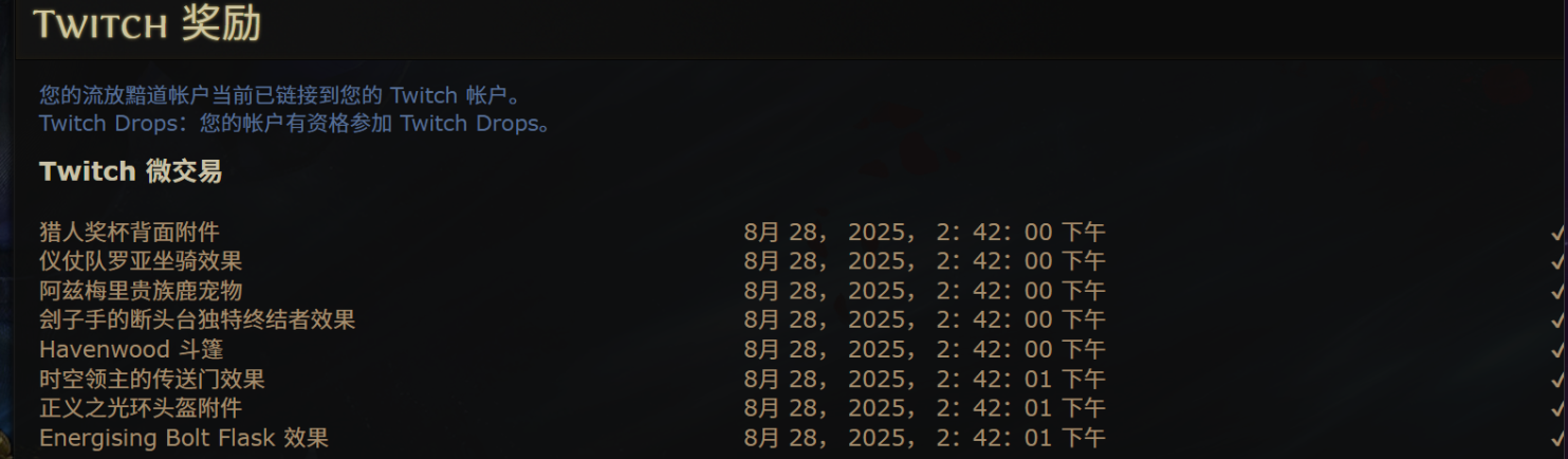 7、授权成功后,会跳转至奖品领取页面,或者点击链接查看: https://www.pathofexile.com/my-account/twitch