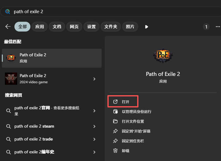 3.安装完成后,win键搜索path of exile 2,点击“打开”,开始本体游戏的下载和安装