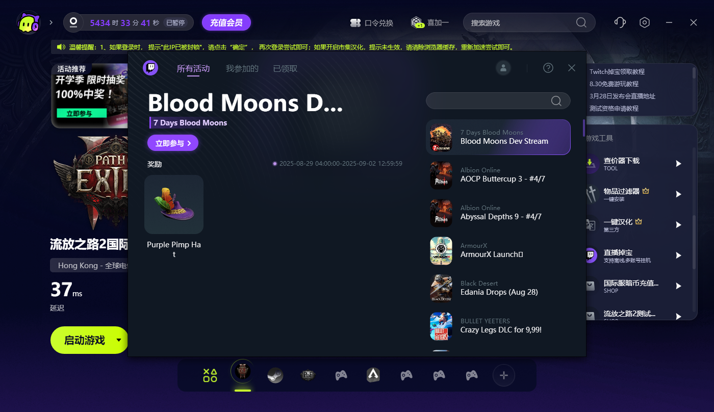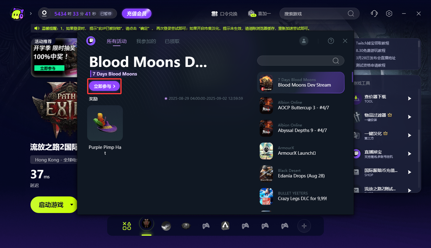 7.参与掉宝活动,搜索Path of Exile 2,点击“立即参与”(流放之路2的掉宝活动在8月30日开启后才会显示,这里以七日血月为例),等待掉宝完成。