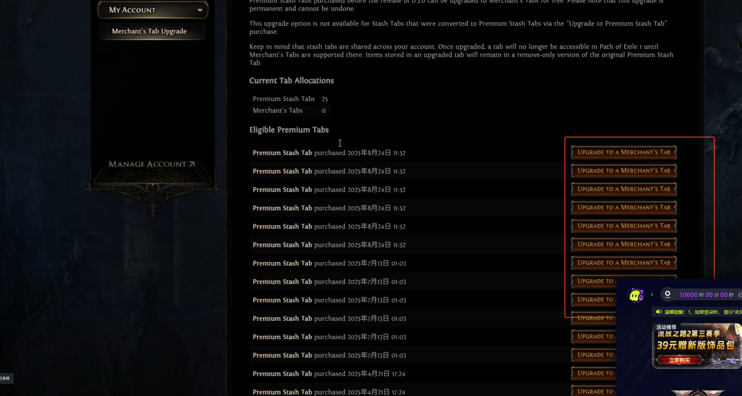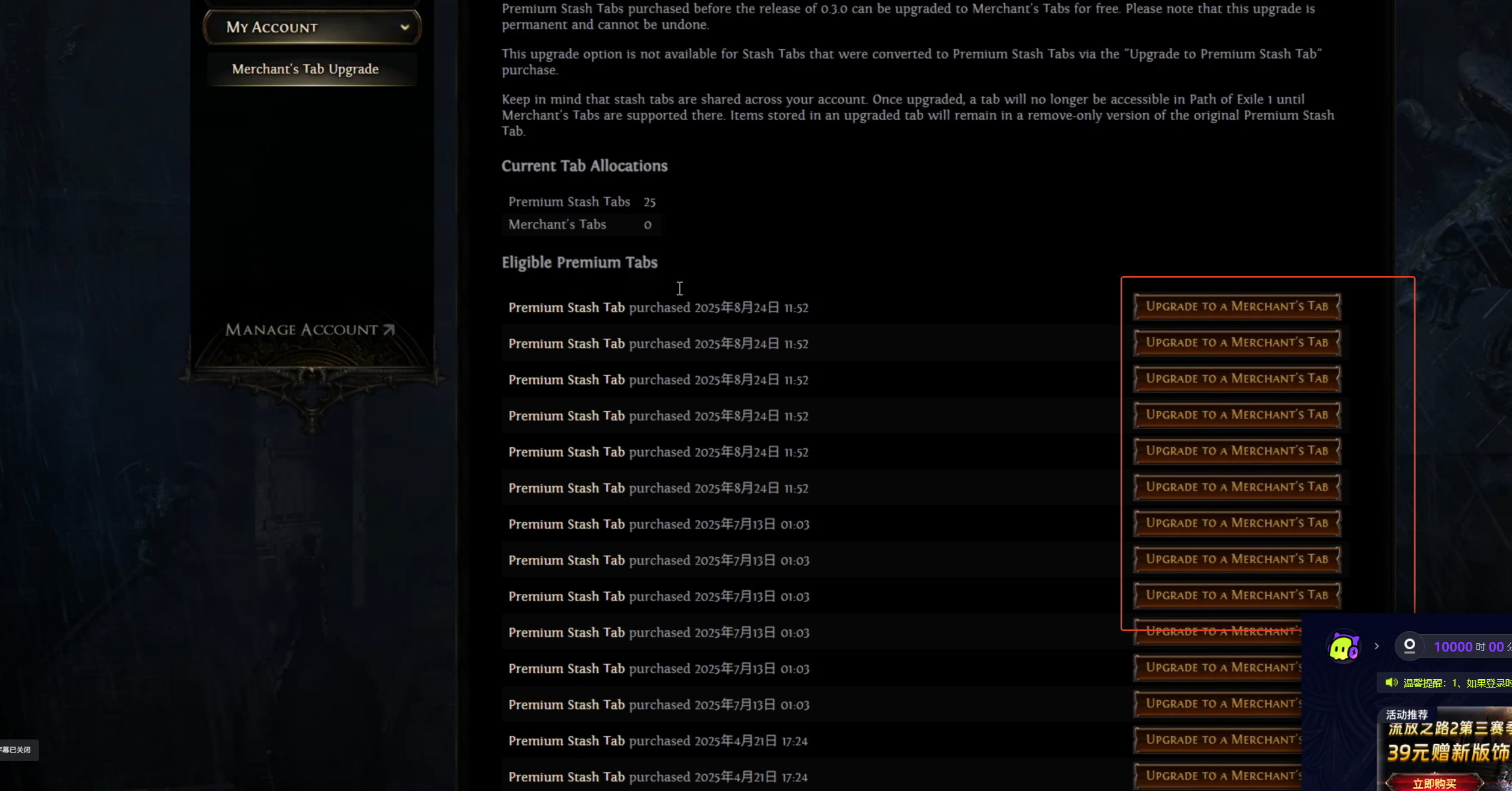 点开后就可以看到你的所有高级仓库,点击UPGRADE TO A MERCHANTS TAB就可以将高级仓库升级为离线仓库