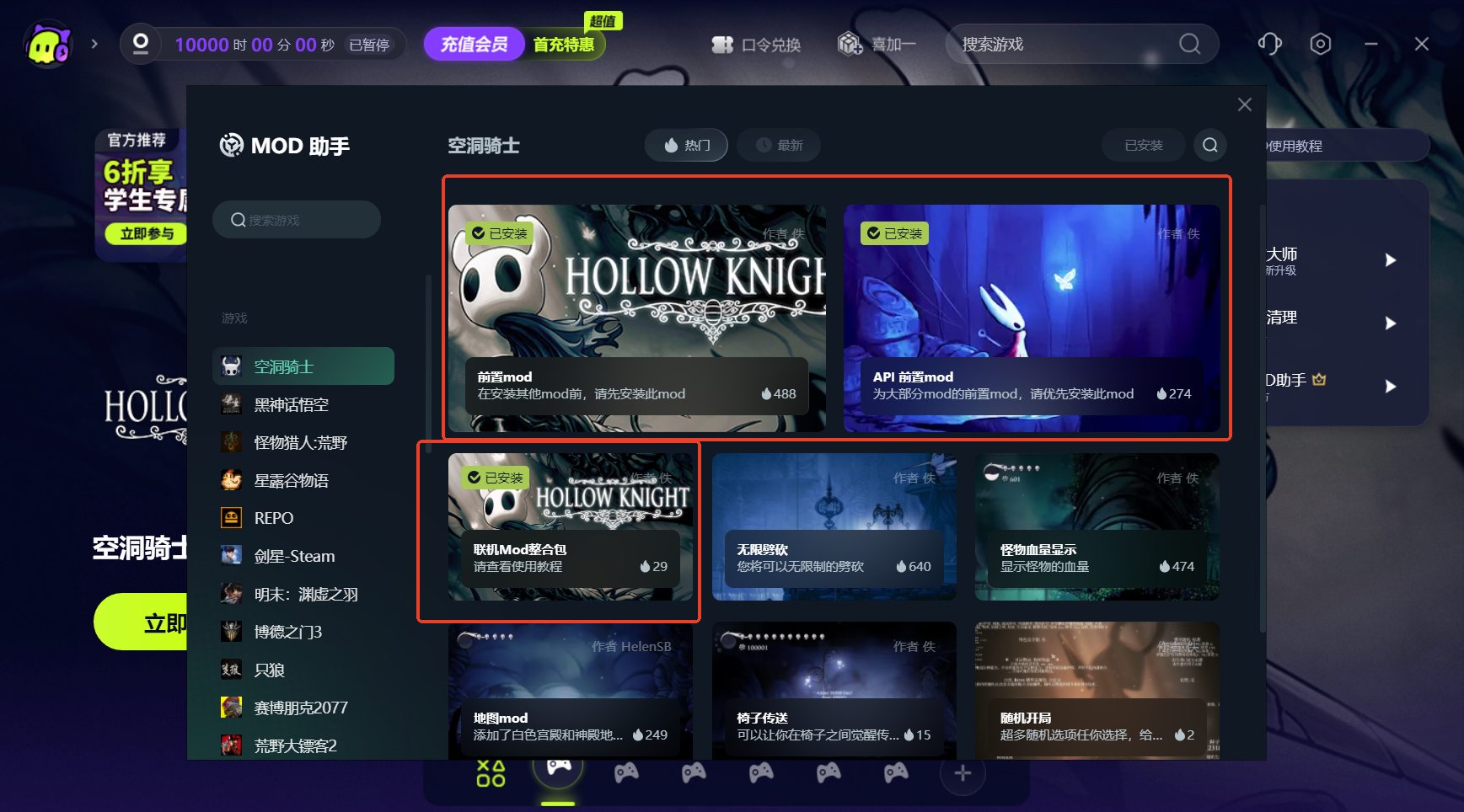 首先,打开古怪加速器找到空洞骑士游戏加速页,点击客户端工具栏中的MOD助手