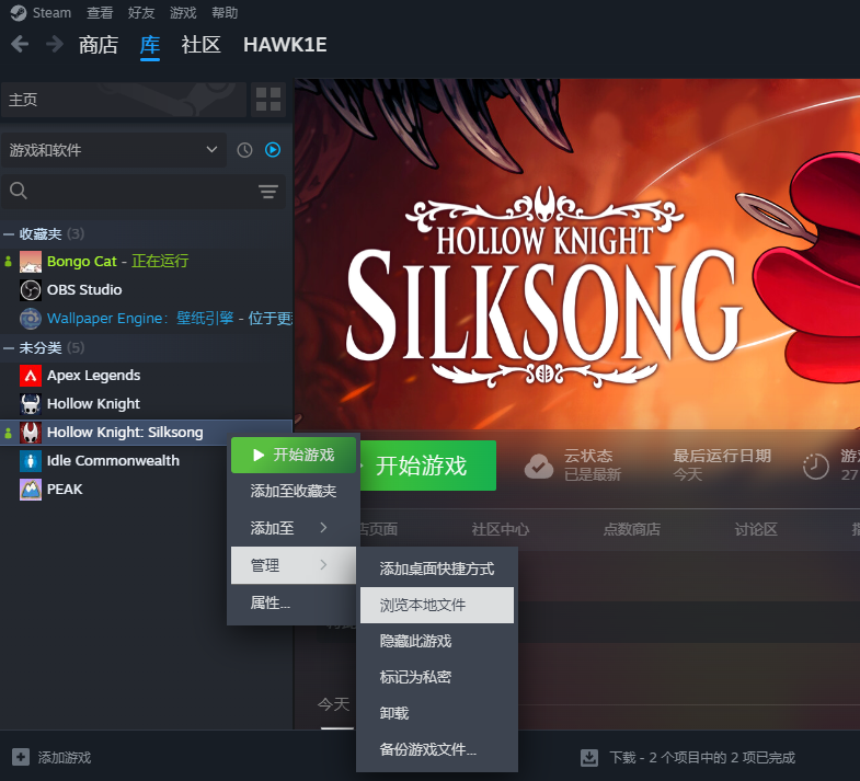 2.在steam库右键单击游戏-管理-浏览本地文件,打开本地文件夹