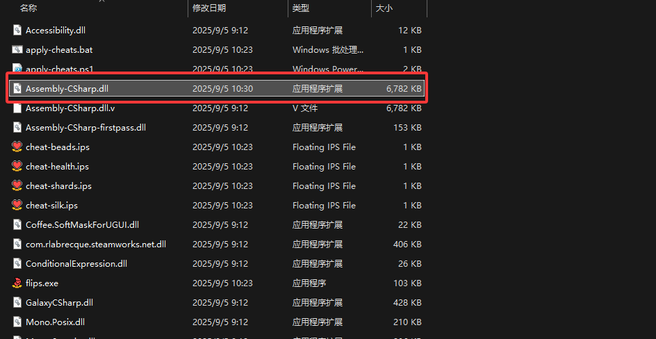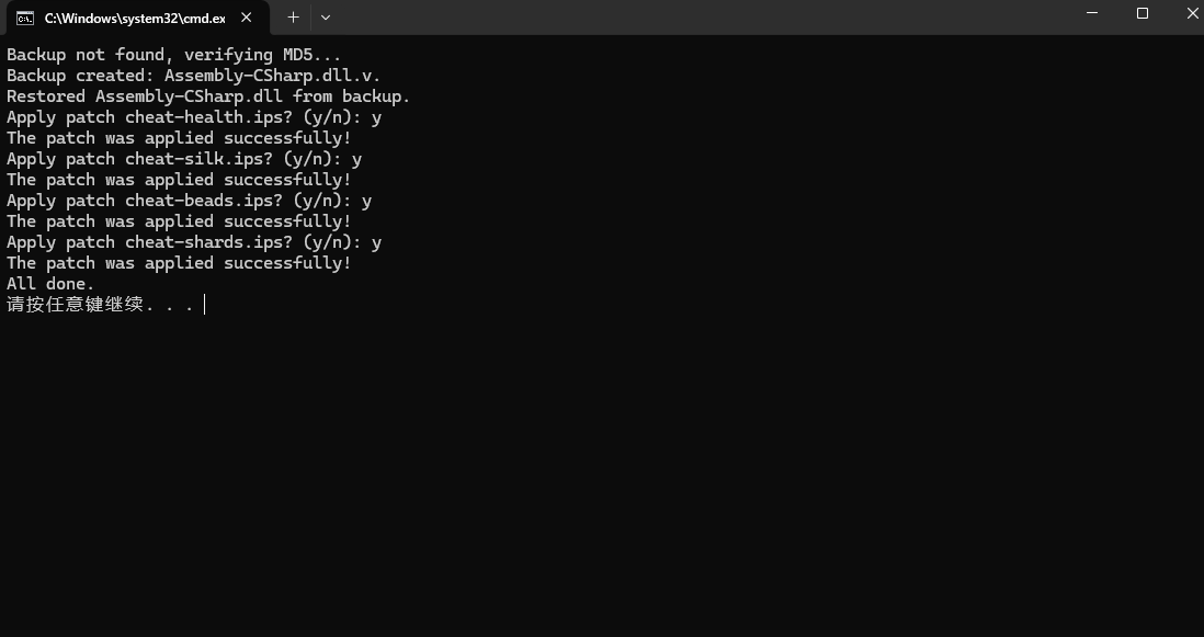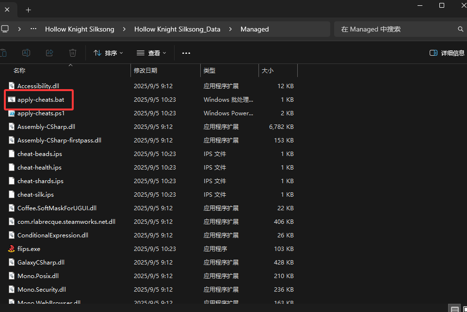 3.进入Hollow Knight Silksong_Data\Managed,找到apply-cheats.bat,双击