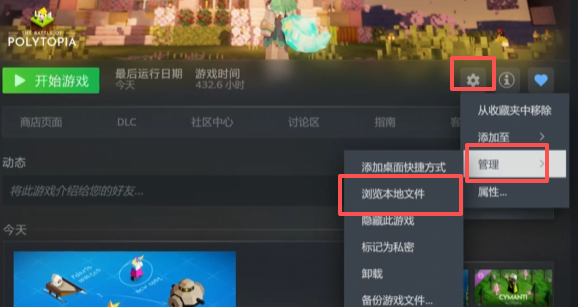 2.打开游戏客户端,steam库中右键单击游戏或者左键单机齿轮-管理-浏览本地文件
