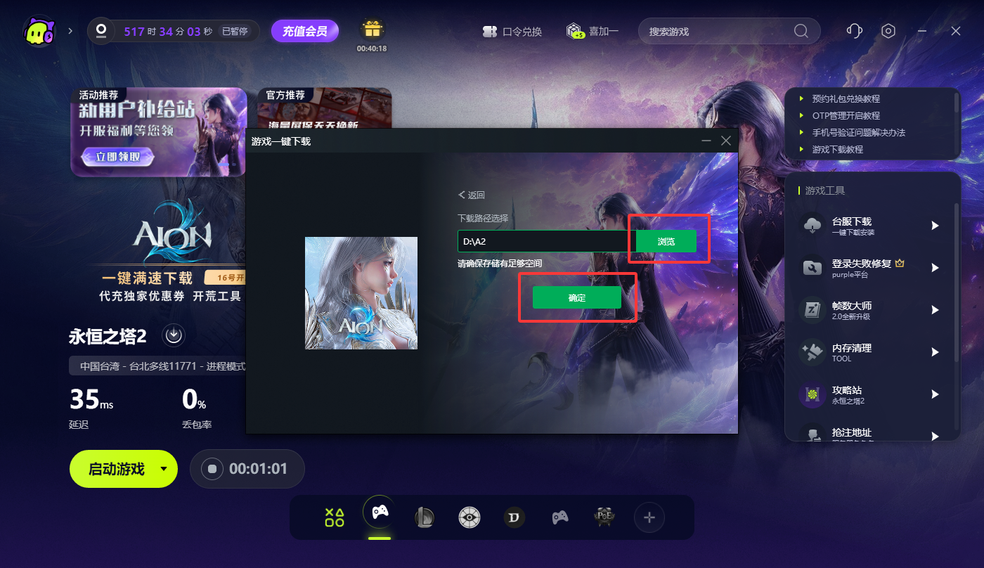 1.加速游戏,点击右边“台服下载”,点击“一键下载安装”