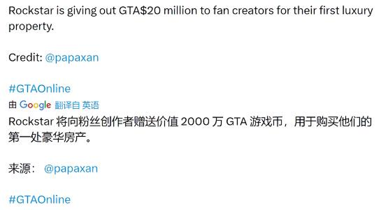 - R星将为外网一些GTA玩家社区的有影响力的创作者们一次发放2000万游戏币,以供他们率先轻松体验到豪宅的内容,无需为游戏币不足而困扰。