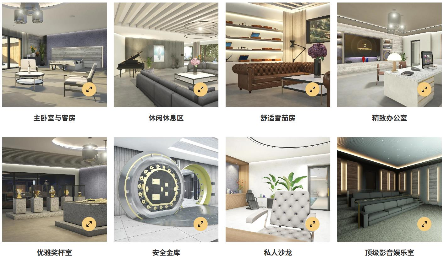 类似于空中别墅,这些内部空间的墙上、桌上、地上的装饰艺术品,可以由玩家自由选择摆放自己喜欢的画作、摆件、雕塑等。满足豪宅主人独一无二的审美和个性化需求。