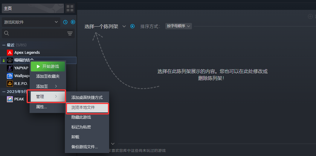 2.来到Steam库中,在左侧的游戏列表中找到“喵喵的结合”并右键,点击管理后点击“浏览本地文件”。