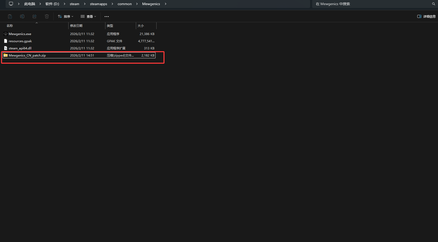 3.将下载好的文件(通常为Mewgenics_CN_patch.zip)移动/复制到浏览本地文件后弹出的页面中。
