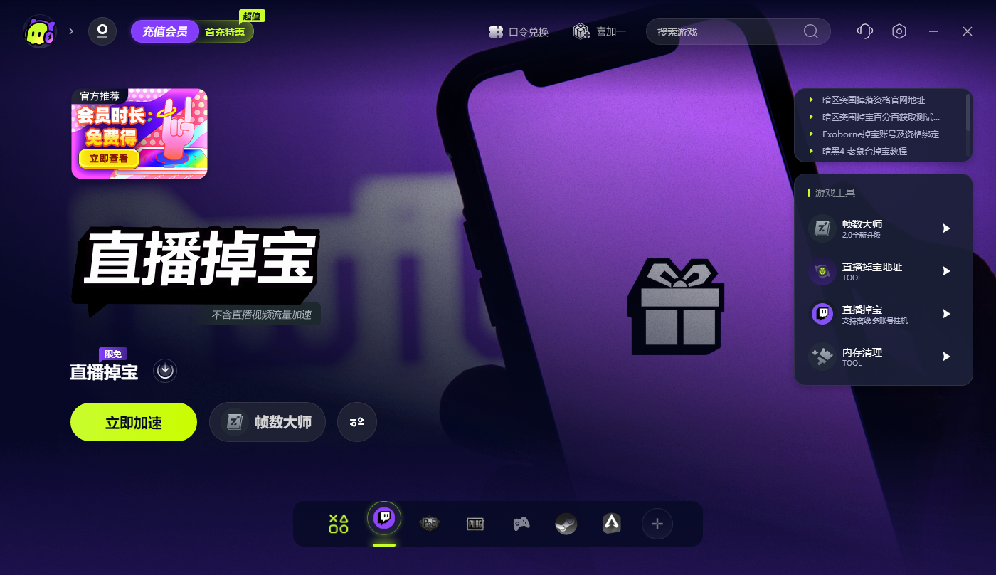 1.首先在加速器中搜索“直播掉宝”,然后点击加速,再点击链接: https://www.twitch.tv/ 便可以进入Twitch网站。2.登录后点击掉宝与奖励3.登录时可能提示验证邮箱,点击右下角【稍后提醒】即可,然后点击右上角头像-掉宝与奖励查看掉宝奖励。4.点击“关联”进行账号绑定。注:部分装饰因超过 6 个月已隐藏至Twitch背包,绑定奖励仍可正常到账。5.跳转到官网,绑定当前TWITCH账号,点击“CONNECT”进行绑定。6.点击图中“Authorize”即可进行绑定。7、授权成功后,会跳转至奖品领取页面,或者点击链接查看: https://www.pathofexile.com/my-account/twitch 注:关联成功后, 其他奖品隐藏在Twitch背包的内奖品仍然可以正常到账。绑定第二个帐号前需要先解绑1.点击图示位置回到账号管理界面2.再点击图示位置解绑账号,再重复本教程全部流程即可绑定第二个账号
